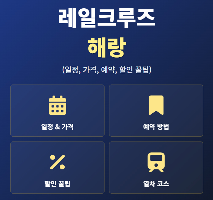 '달리는 호텔' 레일크루즈 해랑 열차의 2025년 최신 여행 일정, 객실별 가격, 공식 홈페이지 예약 방법과 유일한 할인 꿀팁(재구매 할인 등)까지 완벽하게 총정리했습니다. 부모님 효도 여행, 특별한 기념일을 위한 최고의 럭셔리 기차 여행을 계획해보세요!