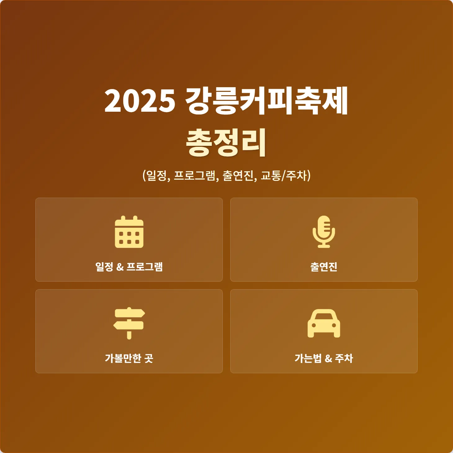 대한민국 커피 수도에서 열리는 2025년 제17회 강릉커피축제! 10월 30일부터 11월 2일까지 안목해변에서 열리는 축제 일정, '100인 100미' 등 주요 프로그램, 예상 출연진 라인업, 그리고 KTX 및 주차장, 무료 셔틀버스 등 가는 방법까지 완벽하게 총정리했습니다.