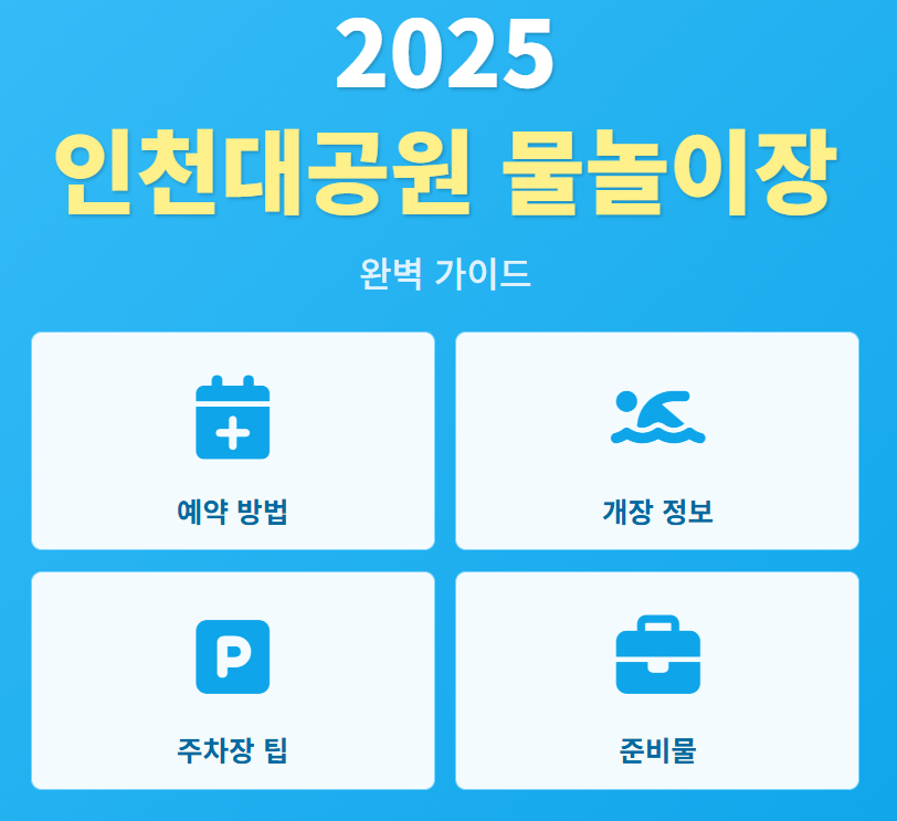 2025년 인천대공원 물놀이장 개장! 100% 사전 예약 방법, 동문 주차장 꿀팁, 다자녀 50% 할인 등 놓치기 쉬운 주차 정보, 그리고 수영모, 아쿠아슈즈 등 필수 준비물까지 이 글 하나로 완벽하게 정리했습니다. 성공적인 가족 나들이를 위한 모든 것을 지금 바로 확인하세요!